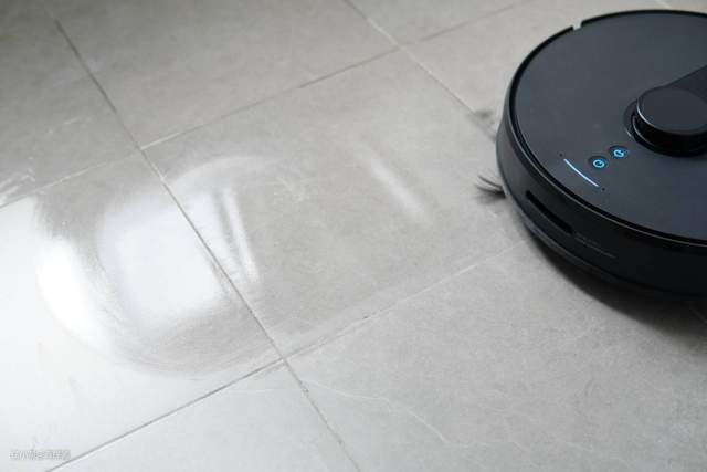 APP里可以设定高、中、低三种出水量,一般木质地板用低水量就足够了,机器因为有主动附压的功能,拖布能紧贴地面,而不是轻飘飘的带过,所以清洁能力还是不错的,比预想的要好不少。可以看到扫地机拖过的地面是很均匀的微湿的状态,浮灰和浅污渍一遍就能拖掉,电控水箱的控水方面还是比较精准的,不会出现干湿不匀的情况。