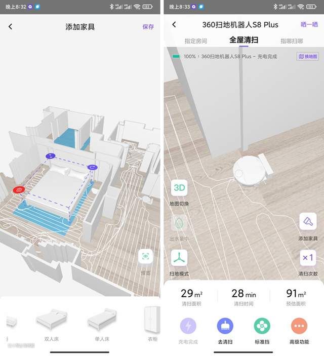地图不仅有2D模式,还可以切换到3D模式,可以旋转,放大,缩小,还可以根据实际情况摆放上多种家具,地图一下就变得直观了起来,所谓的沉浸式体验,大概就是如此。下图右边可以看到扫地机本身也有一个3D建模,还挺精致。