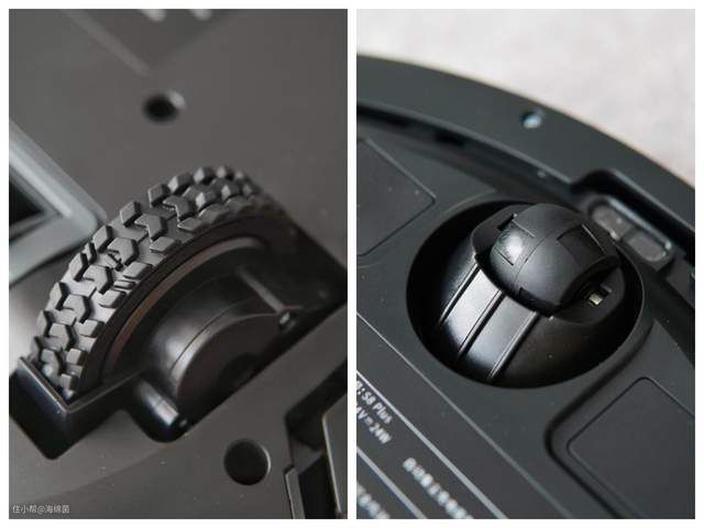 两边是两个履带式主轮,2cm的越障没有问题,家中的门槛和移门滑轨可以轻松越过。前方中间有一个辅助万向轮,能看到表面是棋盘格设计。