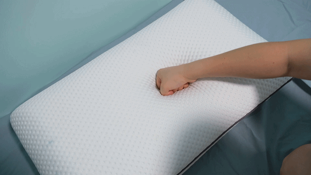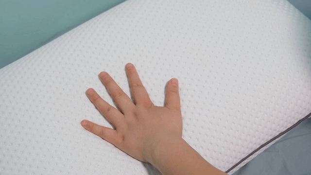 值得一提的是Emma这款记忆枕的正反两面软硬度是不同的,第一层也就是正面的Airgocell海绵睡感会偏硬一些,这一面很适用于喜欢睡感硬实的用户群体,它可以很好的提供支撑度,舒缓颈椎压力,从下面的动图当中就可以看到手掌嘉里下压后枕头面的承托效果还是很明显的,就我而言就很喜欢用这一面睡觉▼