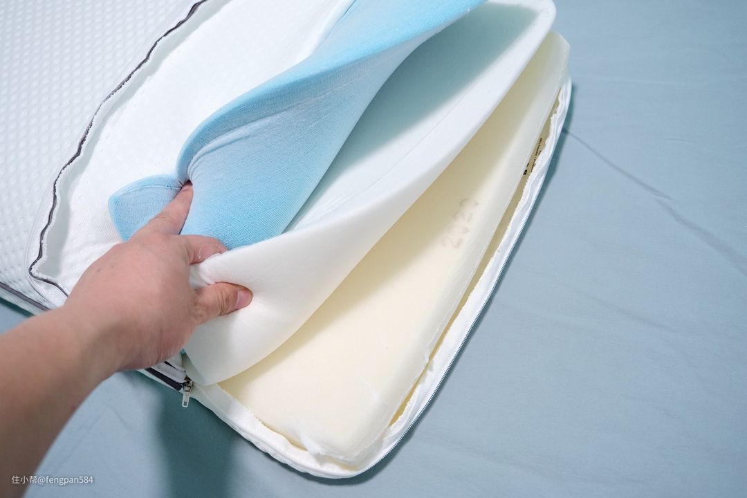 在其右侧面设置有拉链开口,方便随时调整枕头的高度,同时拆洗也会变得更为便利,可以看到第一层枕芯为蓝色的材质,这是Emma独家核心Airgocell技术-海绵中的蓝色凝胶因子,它的手感特别绵实还有良好的回弹性,在工艺上增加了海绵中的孔洞,兼备更好透气的效果▼