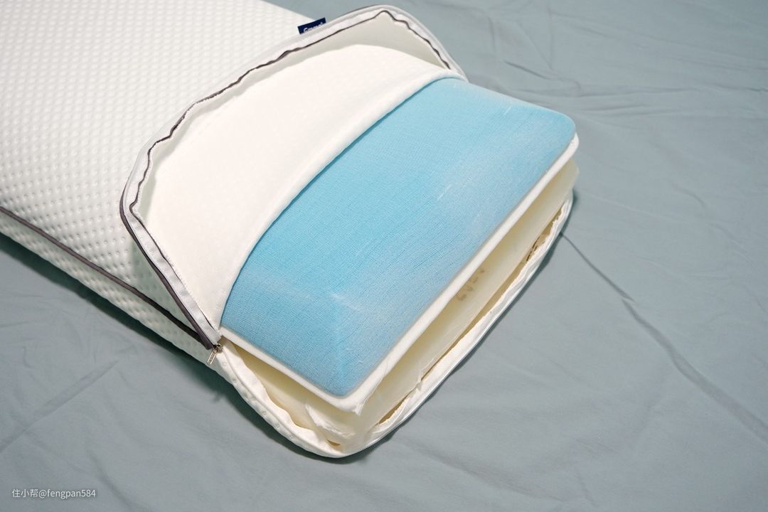在实际的睡眠体验感受方面,先试睡了一下Airgocell蓝色凝胶海绵这一面,相比家里之前的乳胶枕头而言,睡感的承重度要明显硬实不少,一头压上去没有明显的落差感,衬托感很明显,是一种软绵而又不硬实的感受,在仰睡跟侧睡的时候能够贴合头枕部的轮廓,特别是在配合家里的乳胶床垫侧睡的时候Emma记忆枕三层的内垫高度达到12cm,可以让脊柱保持很好的生理平衡,让睡眠体验更加舒适这样第二天起身后会有明显的的舒缓感▼