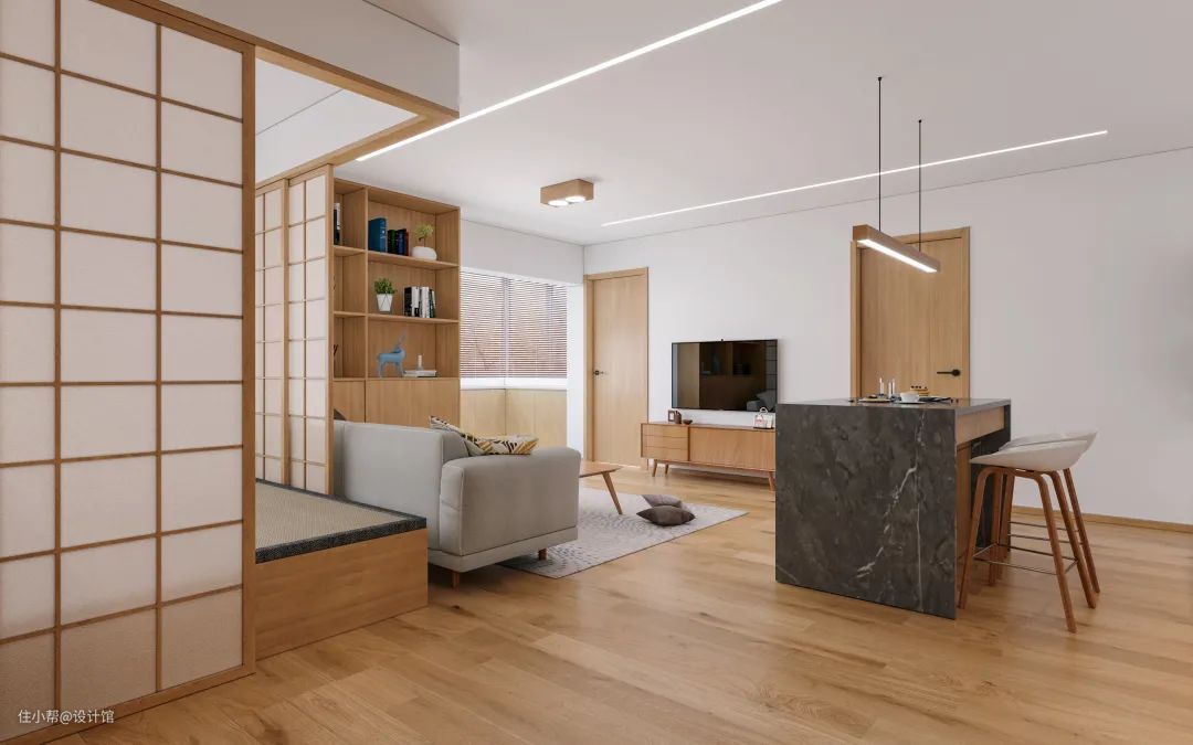 ▲沙发后方是一个休闲室,以定制地台抬高,垫上定制的垫子,装上屏风门,内部还装了收纳柜与展示格,整个空间充满简约自然的实用感,让这个空间可以充当家人休闲娱乐、客人睡觉的客房,一房多用、非常实用。