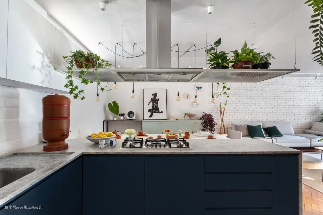 另外,厨房岛柜上方的悬挂平台还兼具置物的功能,上面摆放了不少绿植,用来点缀上层空间,为整个带来了生机。绿植作为软装八大类中的百搭元素,使用起来不易出错,很容易出效果,在本案中有较多的运用。