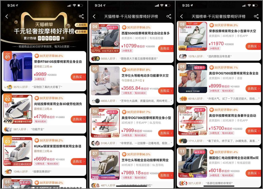 再来看某喵的“千元轻奢按摩椅好评榜”。