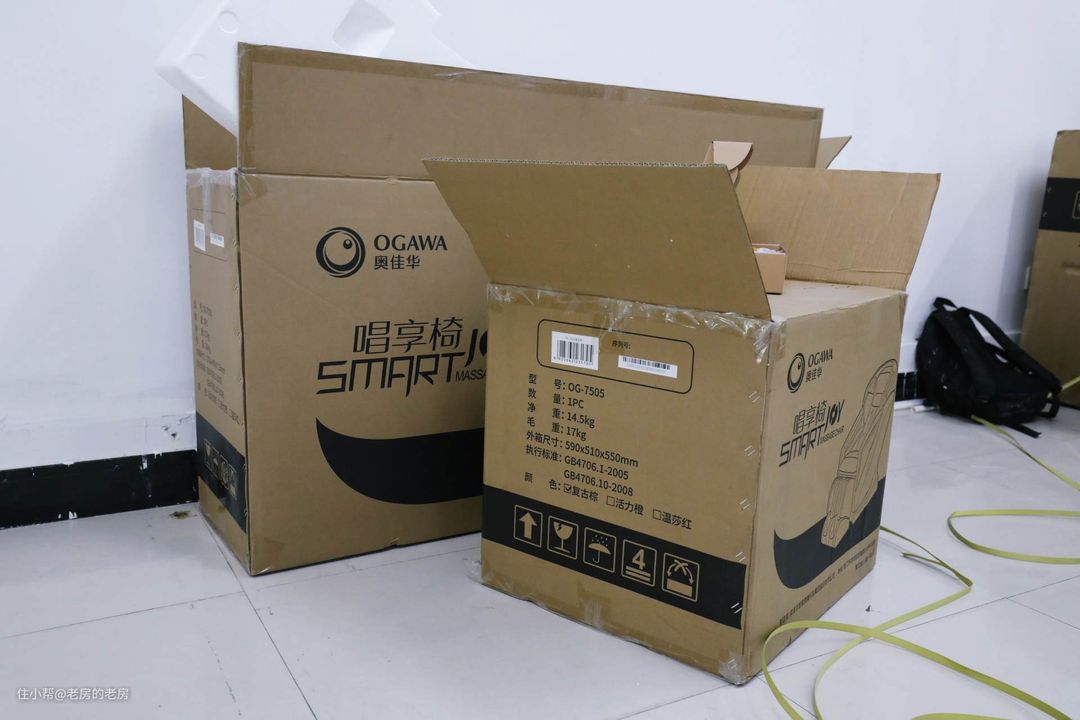 奥佳华 OG7505 一共有三个大箱子,安装看似复杂其实并不需要担心,收到货后厂家会主动联系,安排师傅上门安装、调试,当然这一切都是免费的。