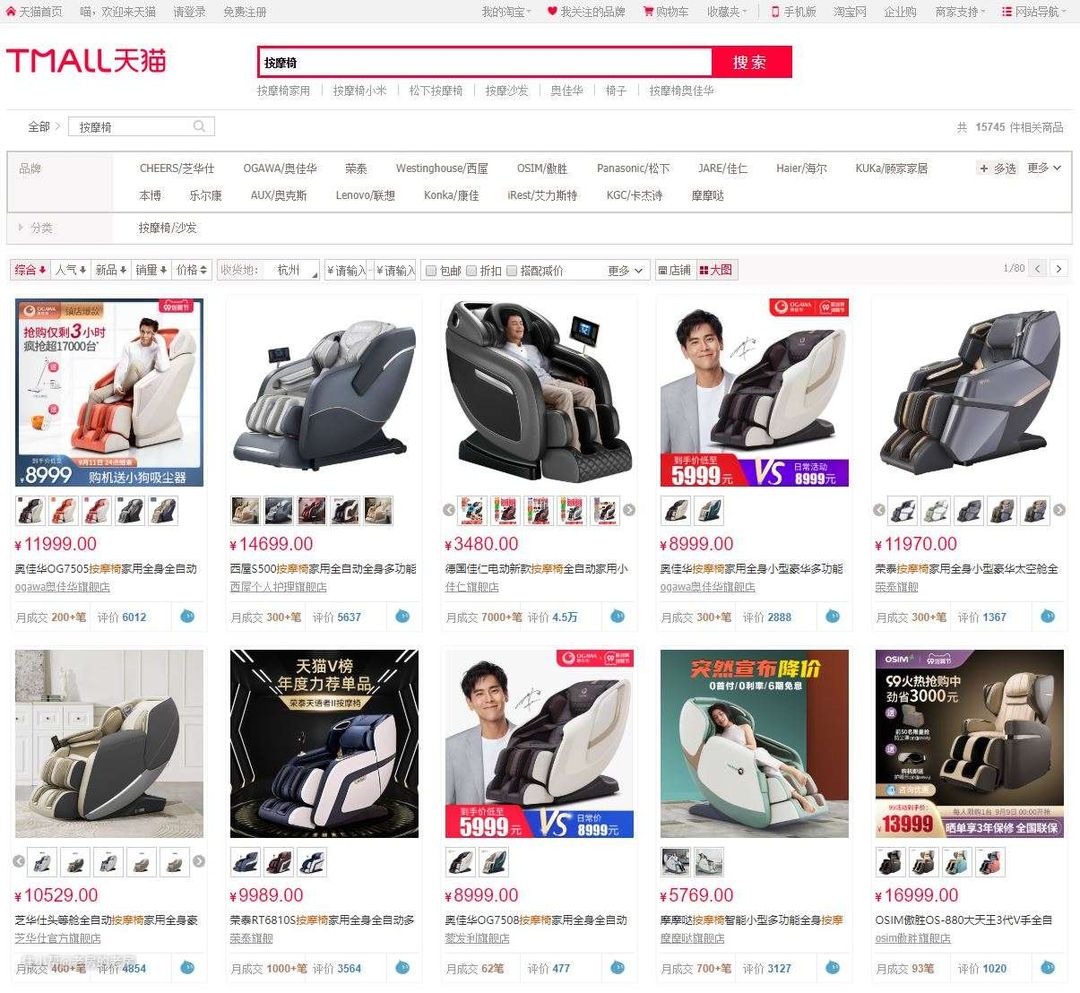 首先直接在某喵上直接搜,前十位品牌集中在奥佳华、西屋、佳仁、荣泰、芝华士、摩摩哒和傲胜中。其中奥佳华和荣泰有多个型号入选。