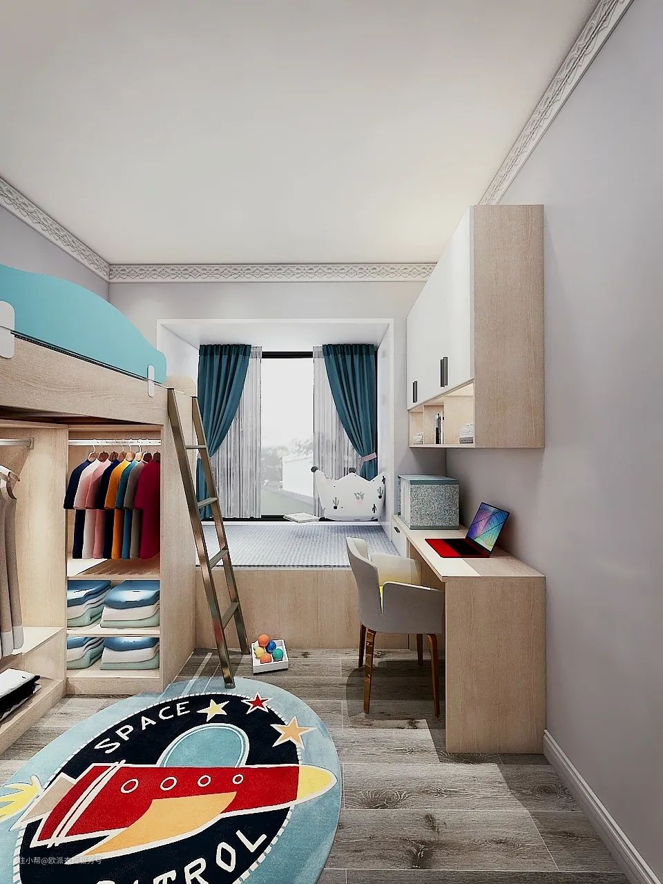 卧室设计的上下铺位,巧妙地利用下铺改造为衣帽间,内设有简单的搁板放置衣物。整个衣帽间不仅高档,收纳能力也非常可观,有挂衣区和叠放区,是这间卧室里最引人瞩目的区域。