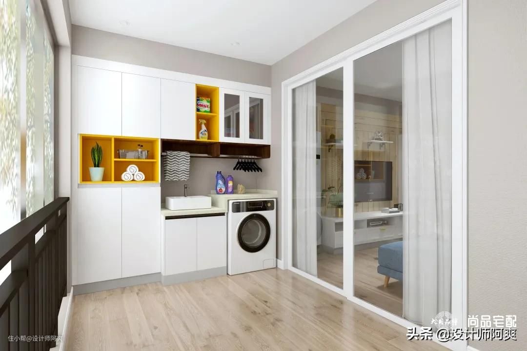 ▲既能洗衣晾晒、又能休闲阅读的多功能阳台,可以设计卡座+开放式书架,或者储物柜+沙发,给家人提供更多相处空间。