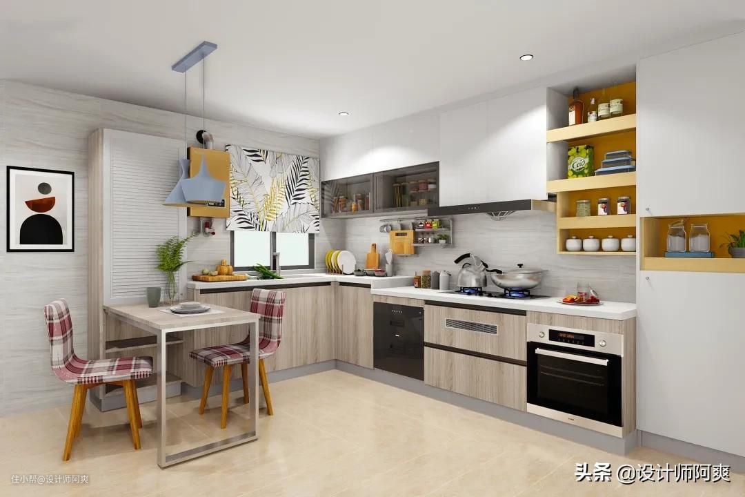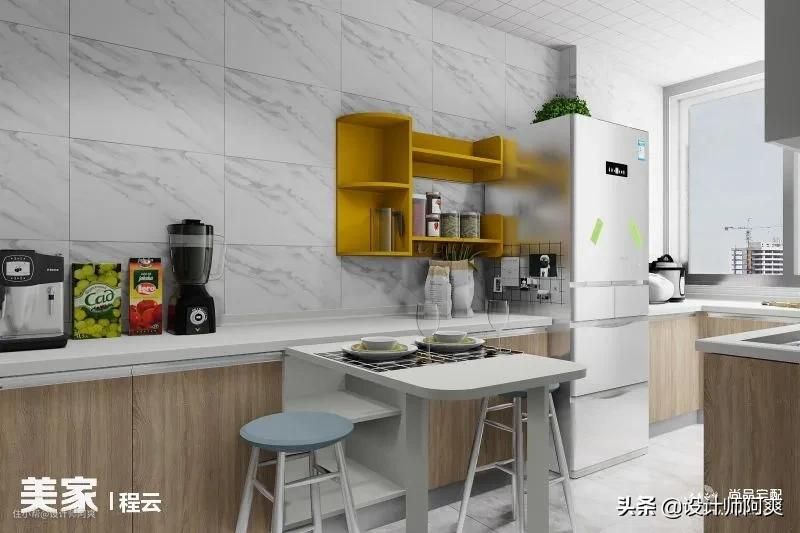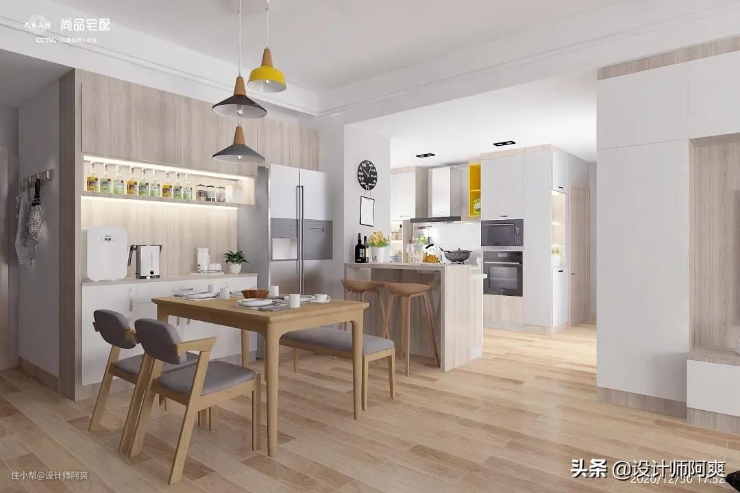 ②厨房做半开放式设计,做吧台隔断,同时提供就餐区;