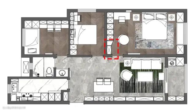 并中部留空,结合石材台面,摆放水壶杯具做水吧区使用。还有,在【万科旭庭】《热恋夏威夷》这个项目,由于主卧门后空间较窄,在规划衣柜时便缩窄设计: