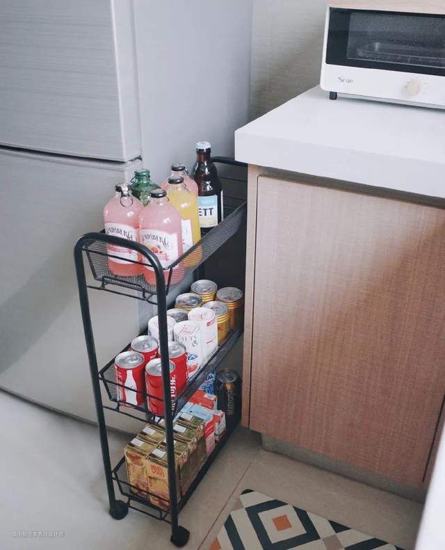 冰箱与墙壁之间最容易有缝隙,这个时候,就需要“缝隙柜”来填充啦~若冰箱放在厨房,冰箱与橱柜的缝隙也非常常见,同样的,缝隙柜或小推车来解决: