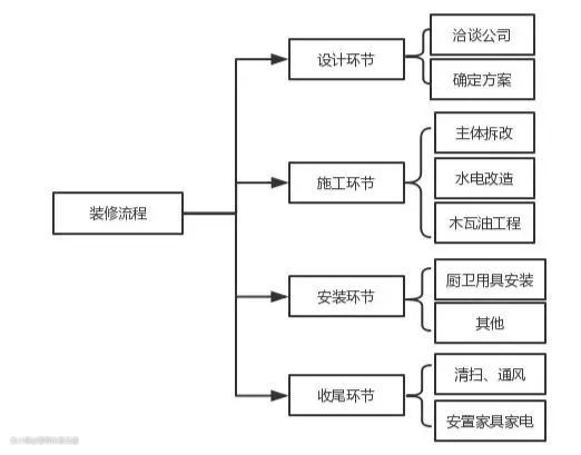 装修可以大致分为四个环节,分别是:设计环节、施工环节、安装环节、收尾环节。