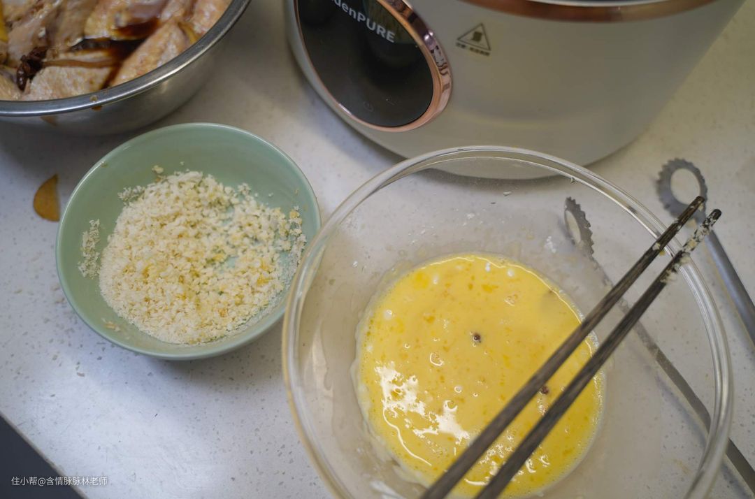▲说到空气炸锅,最主要的鸡翅自然是不能错过,按照官方菜谱准备了面包糠,鸡蛋和生粉,将鸡翅腌制好之后,开始摆进去炸篮。