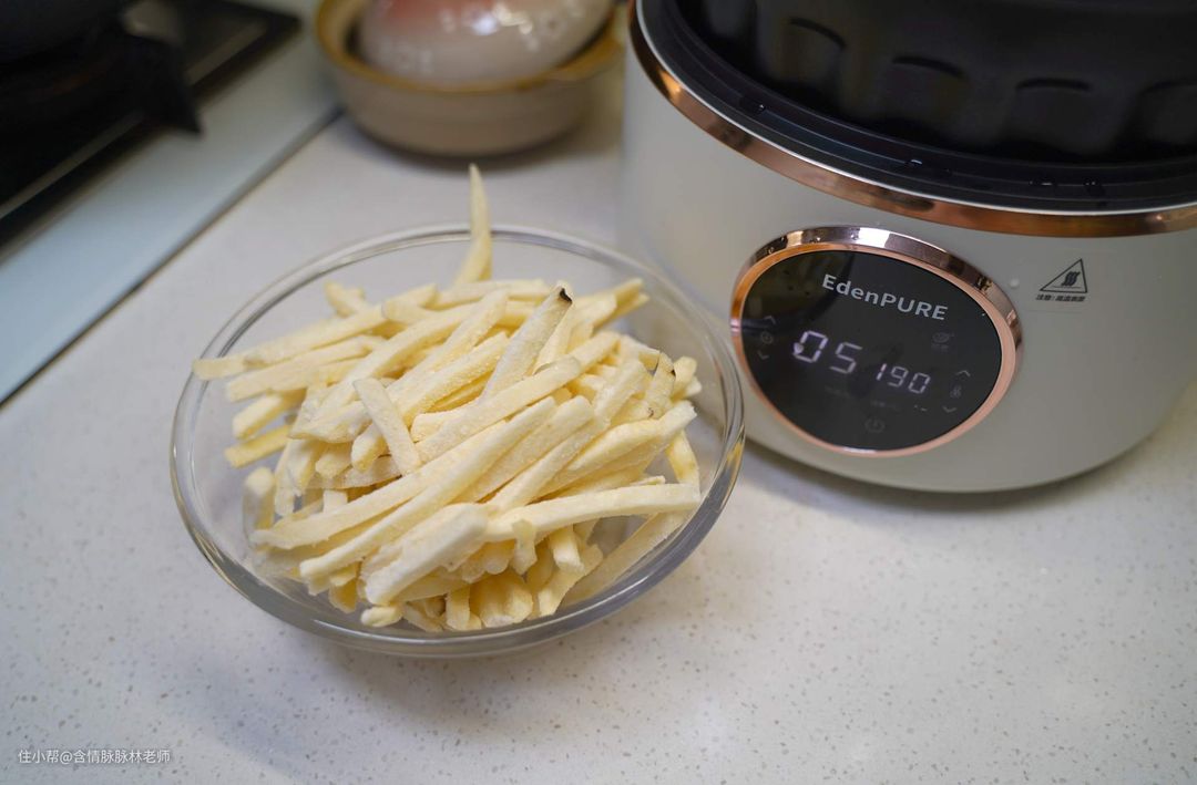 ▲薯条是太太从超市购买回来的,直接解冻,吸干水渍,就可以上炸篮开始烹饪。宜盾普空气炸锅第一个菜单就是薯条,方便得很!