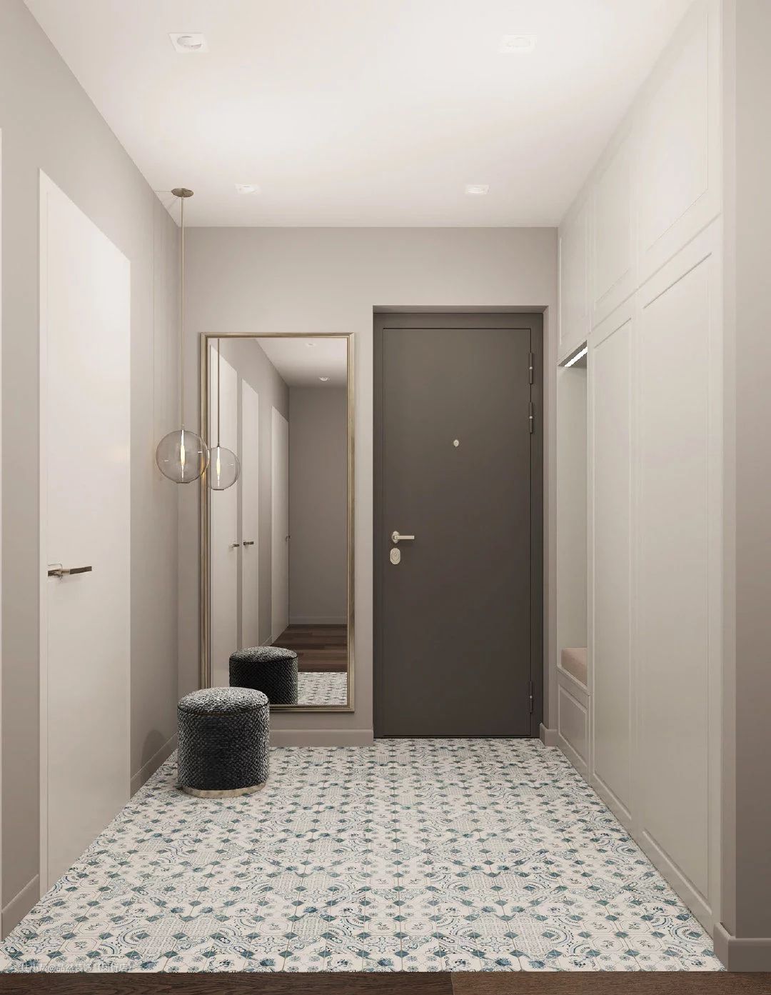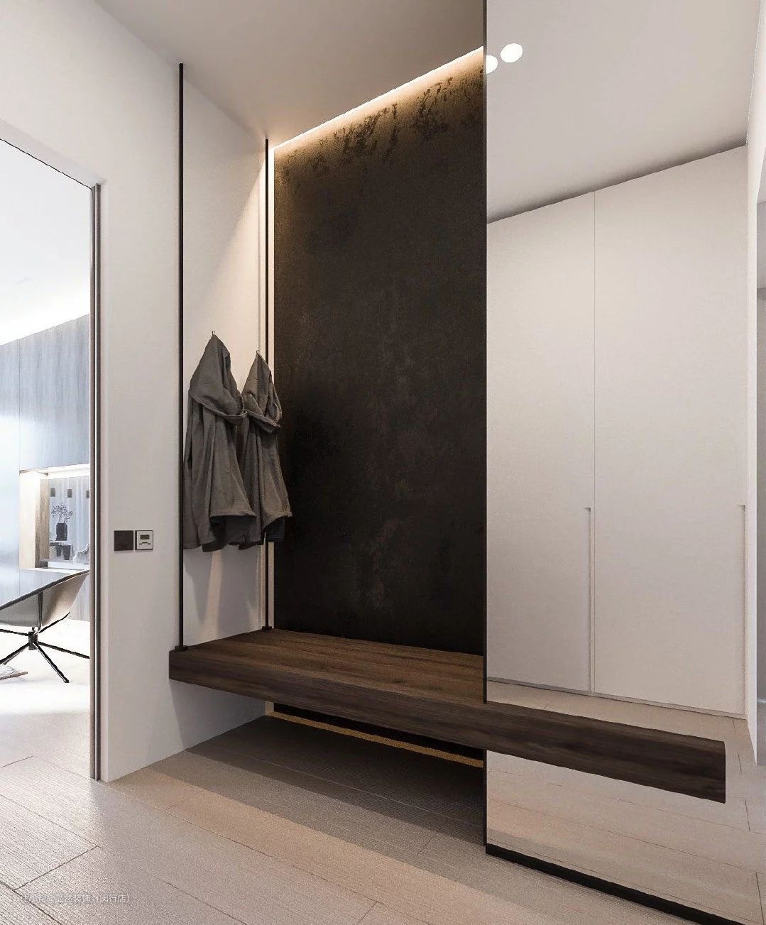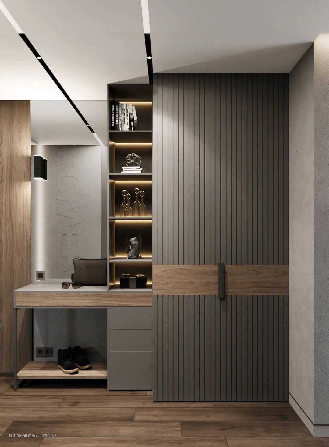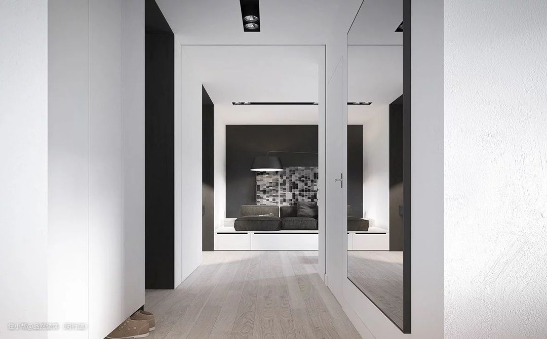 5、嵌入式柜体:嵌入式鞋柜一般和进门吊顶结合设计,保证墙面安全的前提下,利用进门玄关的墙面,将鞋柜嵌入墙体。鞋柜整个隐藏在墙面,顶天立地,不占用玄关或者屋内其他面积,最大程度地节省空间,也增加了不少收纳空间。