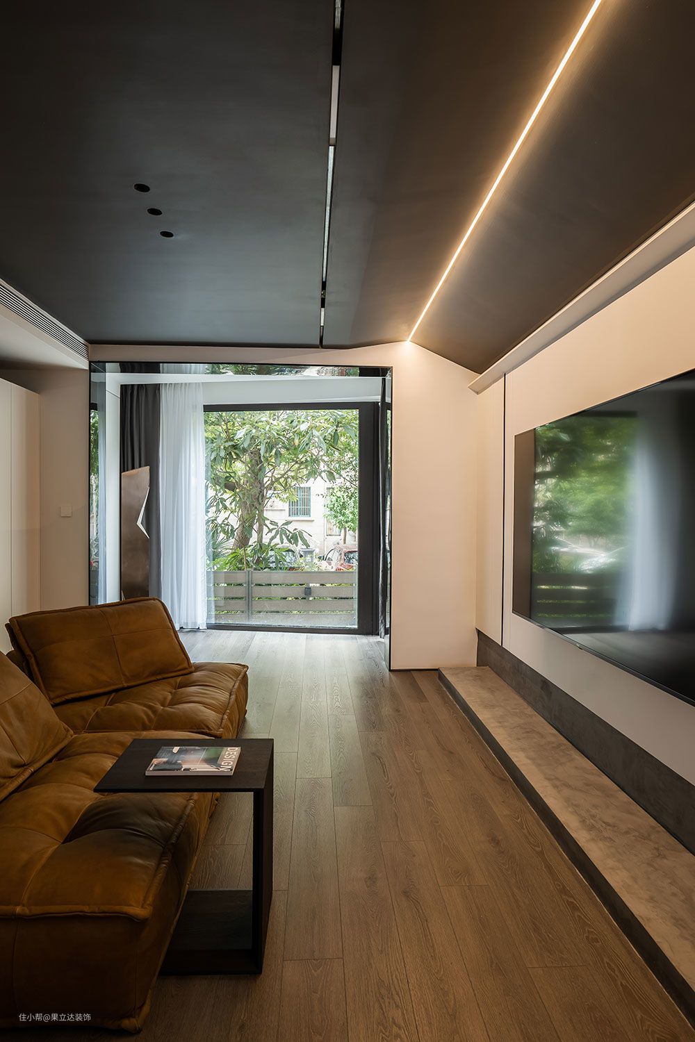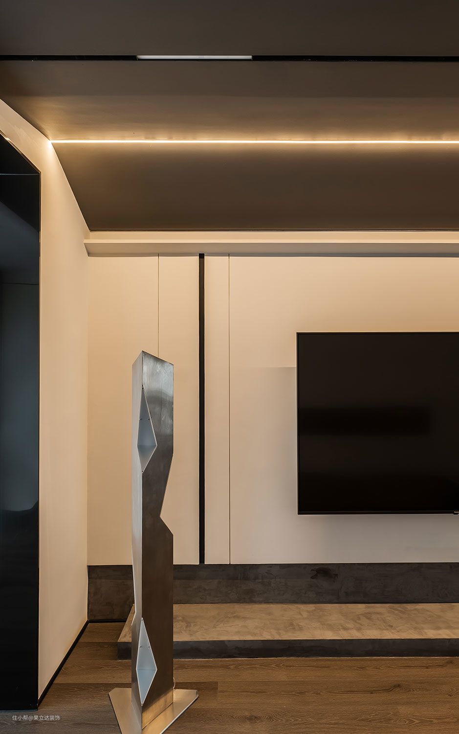 这是我第一次尝试在整个顶面上大面积的去做深色的处理。搭配了3000K的暖色灯光。我在工地现场感受过,效果真的出乎意料的好!灯光照射出来几乎没有漫反射,和光斑。特别柔和,反倒是比起白色的顶面更显得温馨。尤其是到了晚上顶面呈现出来的效果就特别深邃,就像把夜空带回了家。