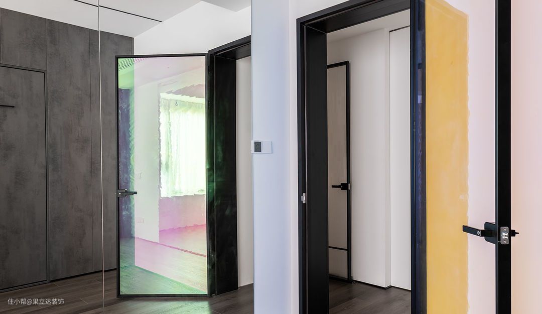 舞蹈房兼顾了客房的功能。因为功能的标新立异,所以在房门的设计上我们选择去定制一扇可以180°平开的炫彩玻璃开门。