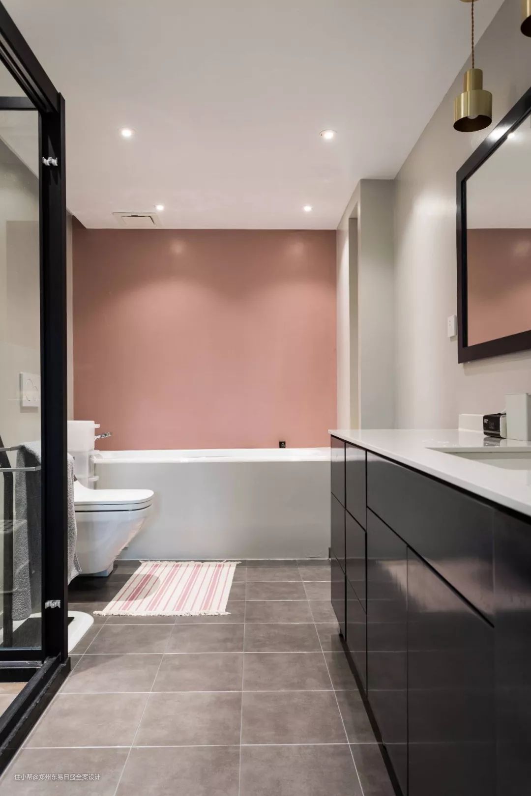 整个家的黑白灰+原木色调,在主卫区域发生了一点小小的改变。浴缸一侧的那面脏粉色背景墙,正好戳中了姑娘心底的小柔软。