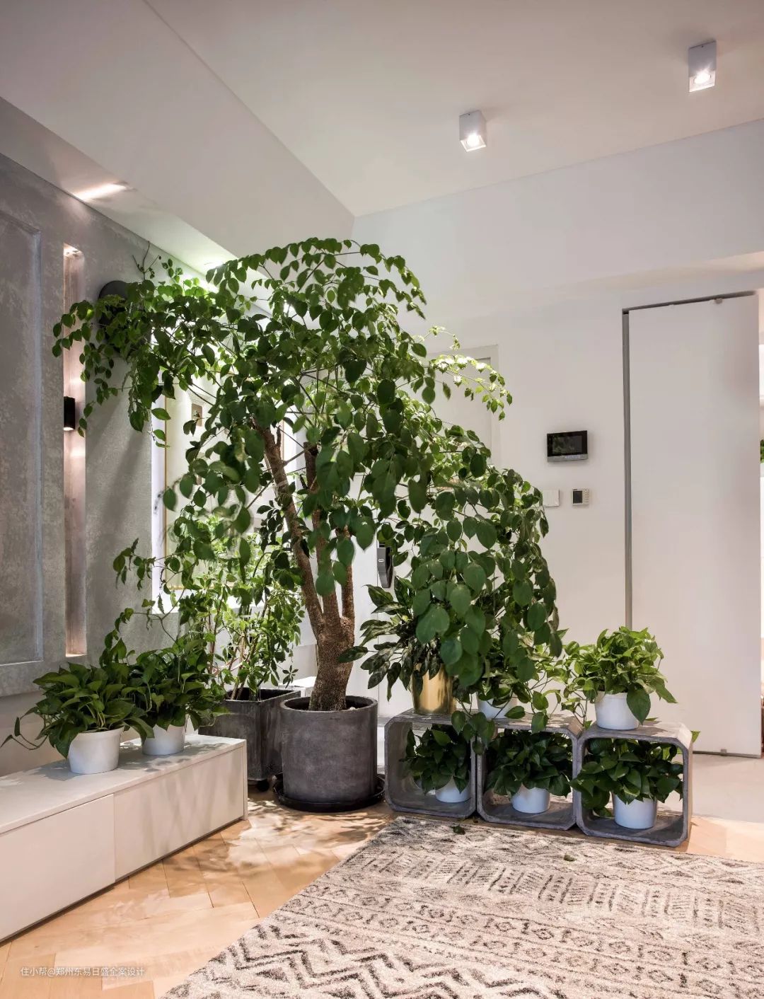 在这里,高低错落、列阵相迎的绿植,不仅仅作为一种装饰而存在,而是巧妙地充当了空间的隔断,将绿意携进家里,让人在家待着也能畅快呼吸。