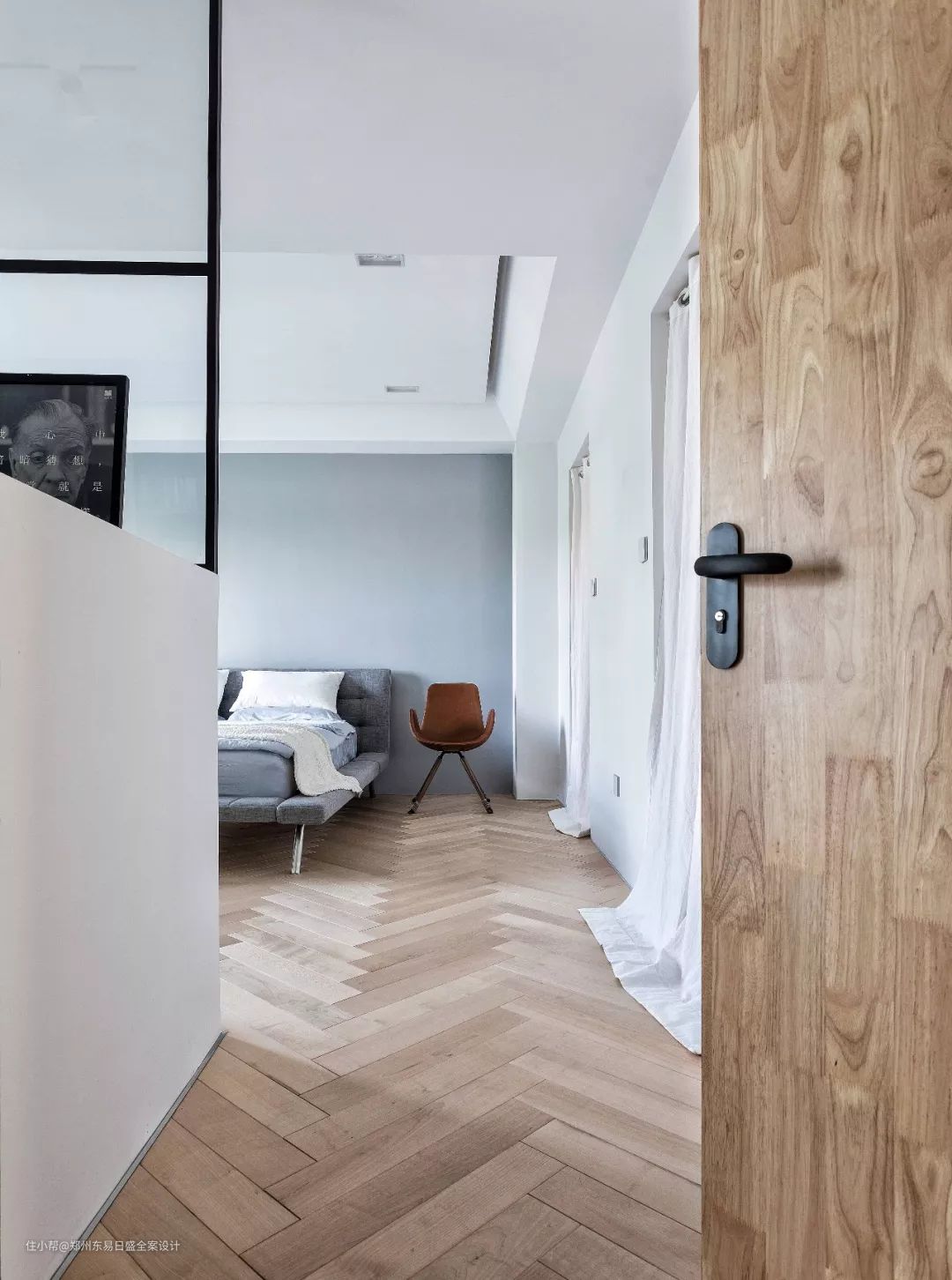 需要减少视觉压力的时候,直接将白色纱帘拉起来,就能形成一个“纯粹”的睡眠空间了。
