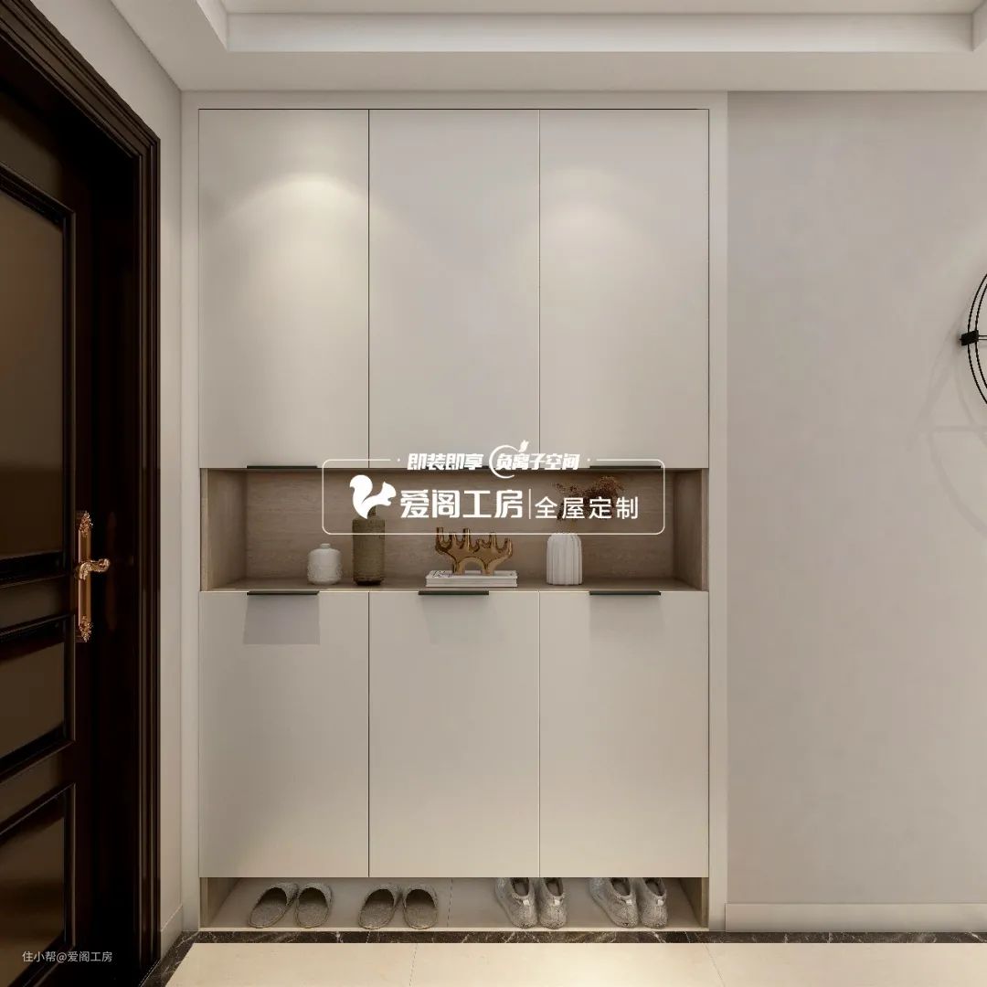 入户玄关,窥一隅而晓全貌。简单的线条,没有夸张的装饰,柜体中间留空,方便随手收纳置物,底部悬空,放置家人常穿的鞋子,方便又不占多余的空间。