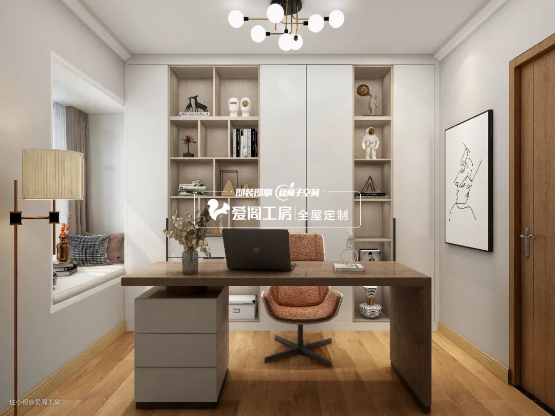 张先生较长时间需要在家办公,对于书房的设计很是看重。书桌+整墙书柜,储物力max,能放下不少书和资料,实用性超强。长条形书桌,放上落地灯,既实用又具备艺术性,完美匹配张先生的办公需要。