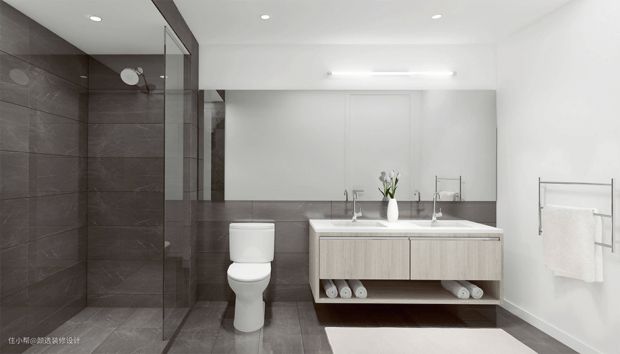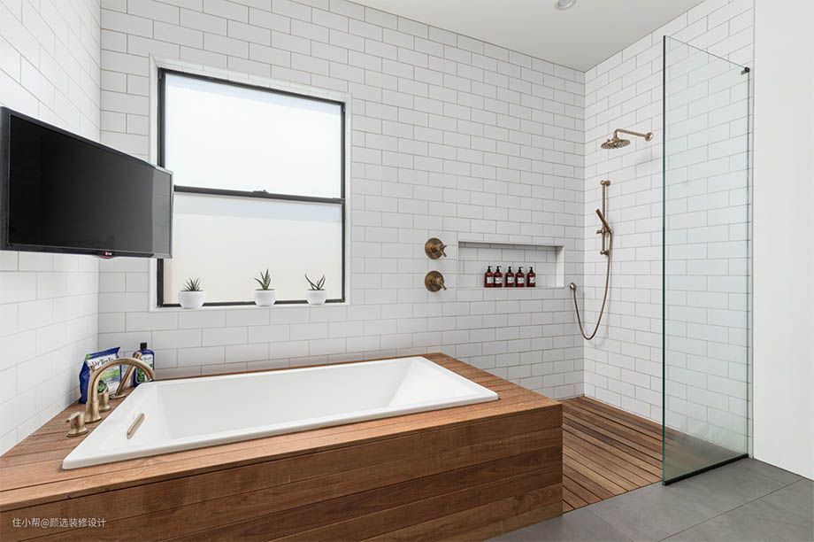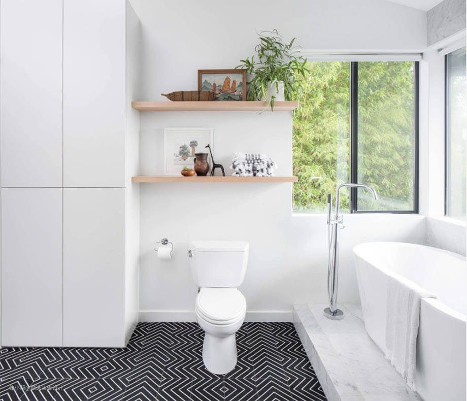 带浴室的房屋风格,元素应该选择朝同一方向看,无论是现代的、极简的、质朴的、等,以创造流畅的线条,在色调、材料和设计上没有冲突。例如,乡间别墅风格,创新或复古,适用于黄铜水龙头、 圆形淋浴头、 珐琅釉面陶瓷盆,用故事演绎经典。现代风格的房子,可选择放有光泽的不锈钢、黑白洁具、简单几何线条的水龙头头、方形花洒,搭配隐藏式壁挂马桶或创新的自动马桶。
