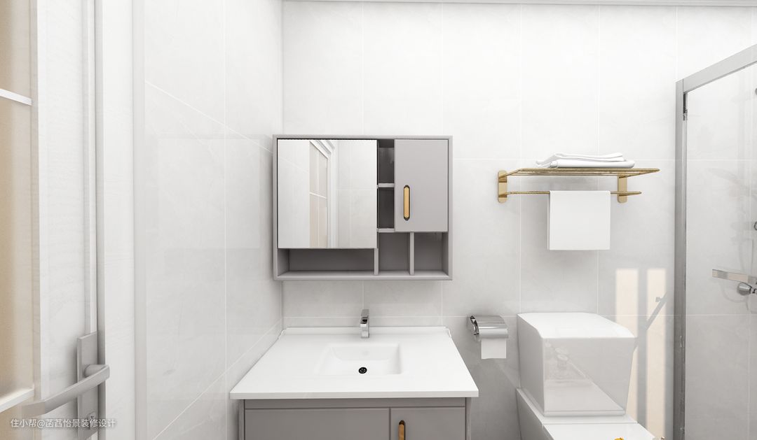 卫生间:家里有老人小孩,所以干湿分区是很重要的,利用玻璃门将干区与湿区分隔开,保障卫生间的干燥与干净。