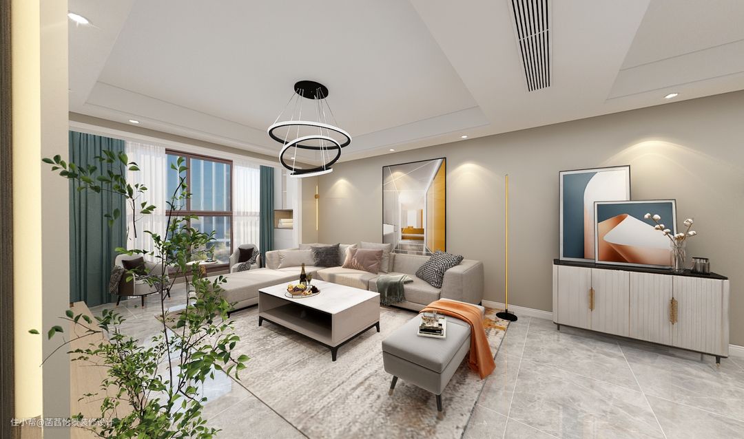 客厅:入户即是开阔的大竖厅,拥有通透的视觉效果,空中交织的光影,干净简洁的现代设计,清爽大气。
