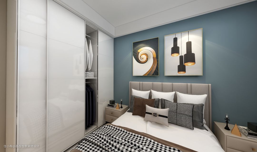 次卧:是给父母居住的,沉稳的蓝色调与灰色调,奠定了空间的基础,平板的衣柜门和两侧的床头柜,都是根据父母的需求出发。