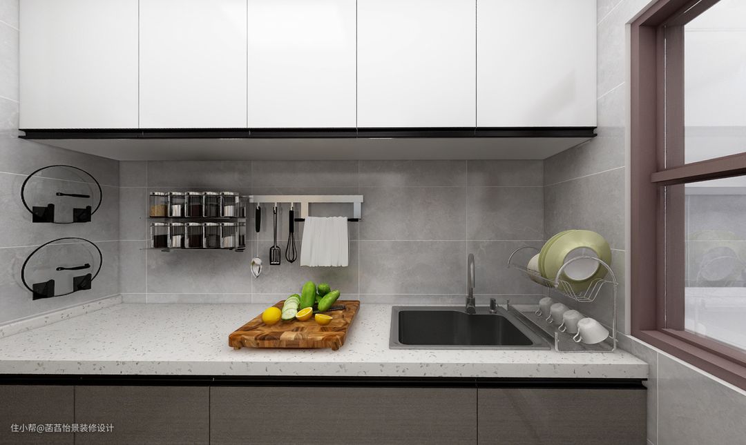 厨房:采用了L型的厨房设计,让操作动线更合理,吊柜+地柜的组合,实现了多空间的组合收纳,上浅下深的色调选择,更方便重油污区的打理。