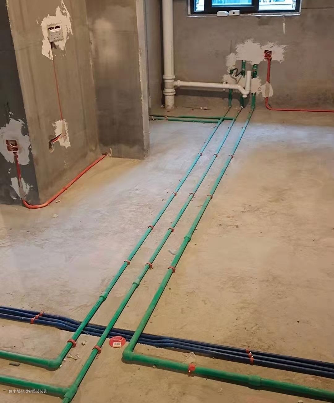 同一楼层使用的管子应尺寸相同,不能一头大一头小,如果附近有消防管时,可以使用大尺寸的绑带将PVC管固定在消防管上,但不能低于吊顶。
