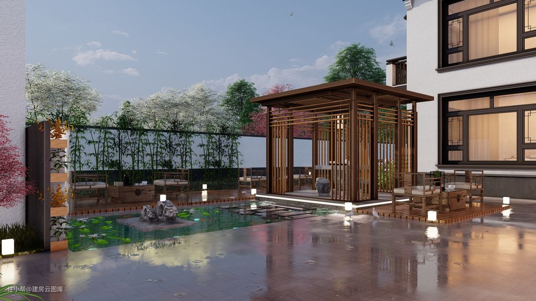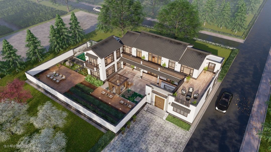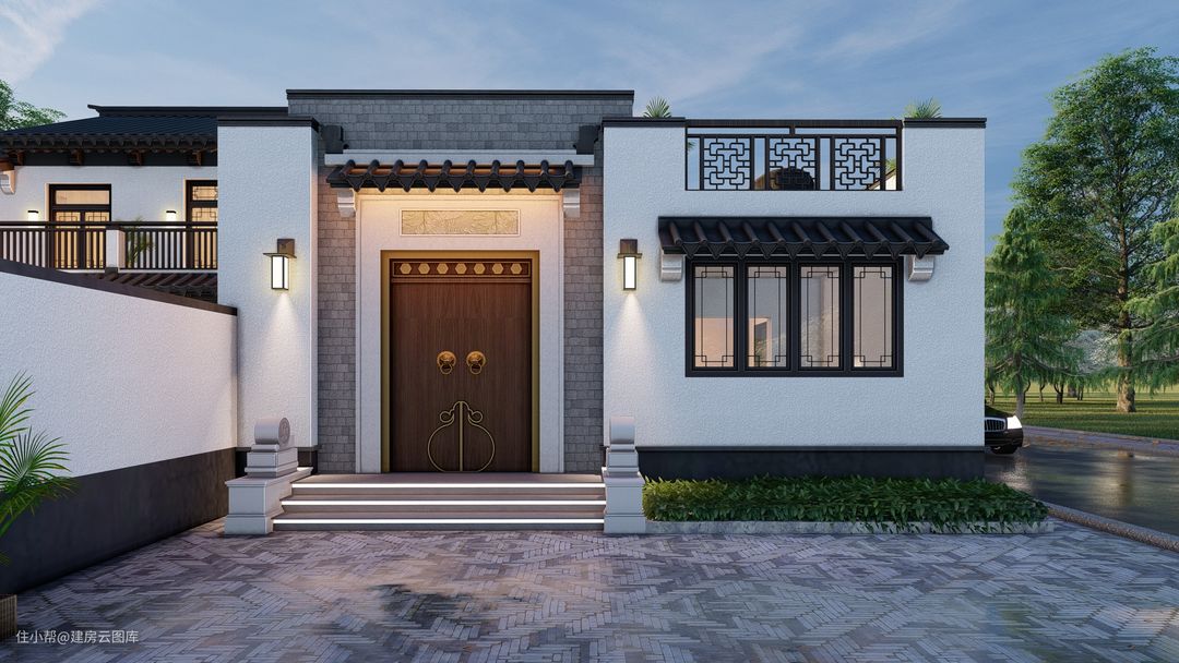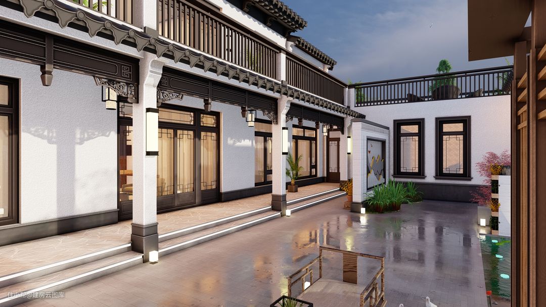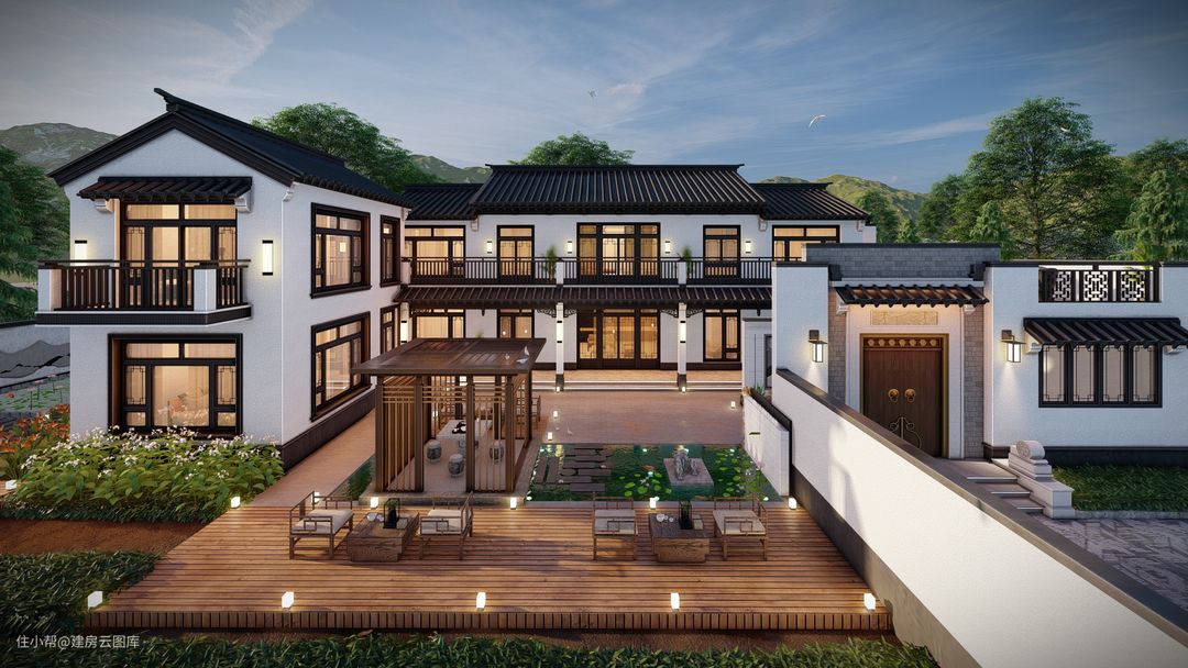 设计师对南北中式文化元素加以提炼,将北方典型的合院与南方典型的徽派建筑风格相融合,白墙灰瓦的整体配色,三段式的广亮大门,窗框、柱子、栏杆、大门,廊道等建筑构件无一不把中式韵味体现得淋漓尽致。