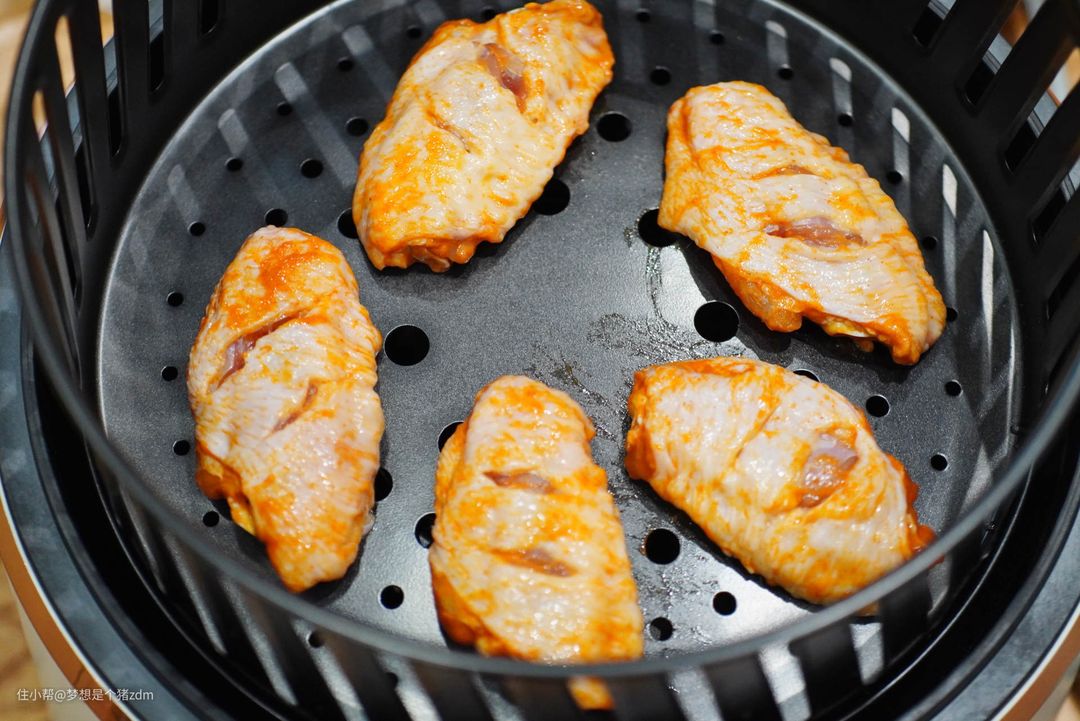 比起在燃气灶上用油锅来油炸来说,我们用空气炸锅炸出来的鸡翅油脂含量会更少一些,而且鸡翅内部保留了适当的汁水,味道还是非常不错的。