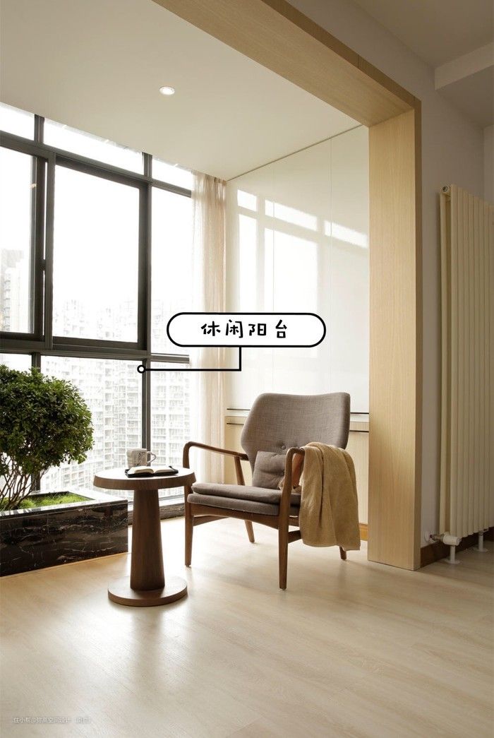 在我做过的很多案例中,年轻人因为配备了烘干机,所以对阳台晾晒的需求不高,反而更想把阳台打造成休闲的功能区。这种阳台布局方式,一般保持阳台的地面和客厅地面用瓷砖或地板通铺,将阳台融合进客厅的空间,再摆放些茶具、几案,做成漂亮的休闲区域。
