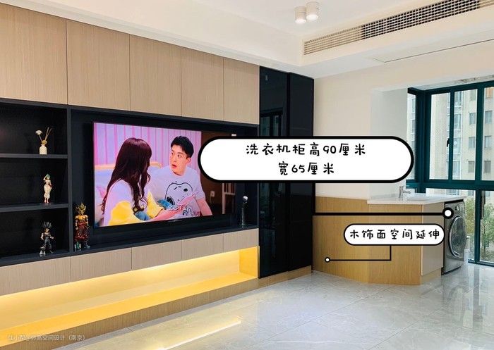 - 一般洗衣机尺寸为 60 厘米(宽)x 85 厘米(高),深度一般为60厘米。所以阳台柜洗衣机区一定要留出这个距离;
