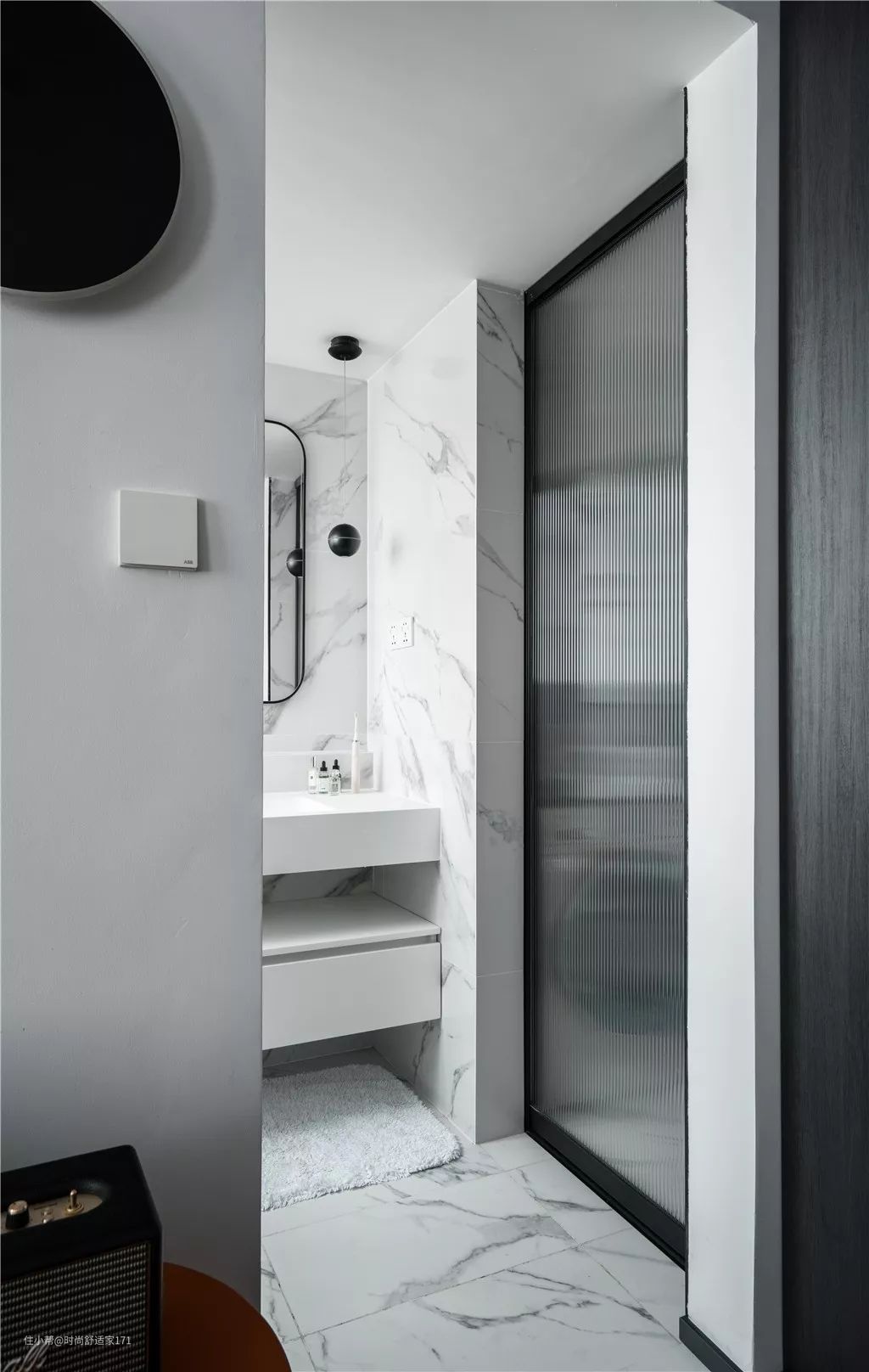 ▲卫生间,将洗手台外移,并安装了玻璃移门,做彻底的三分离设计,解决了早高峰抢厕所的问题。整体以黑白灰色调为主,干净明亮,整体感很强。