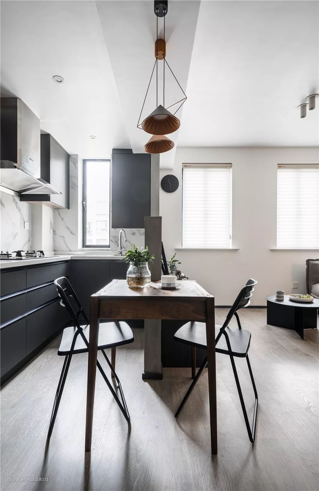 ▲开放式餐厨区,看上去更加宽敞通透,动线也更加合理。厨房定制了深灰色的L型橱柜布局,不仅收纳+操作空间充足,而且干净整洁易打理。
