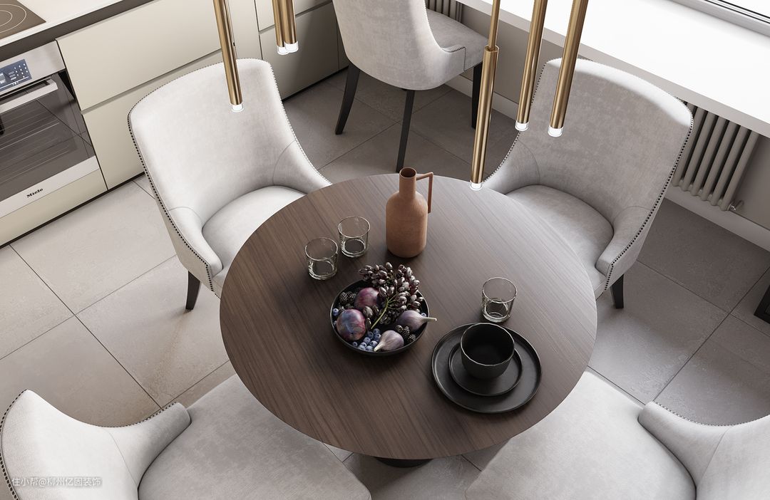 原木纹餐桌,配合线形艺术吊灯,营造出一个柔和的用餐氛围,把极简轻奢的美表现得淋漓尽致。