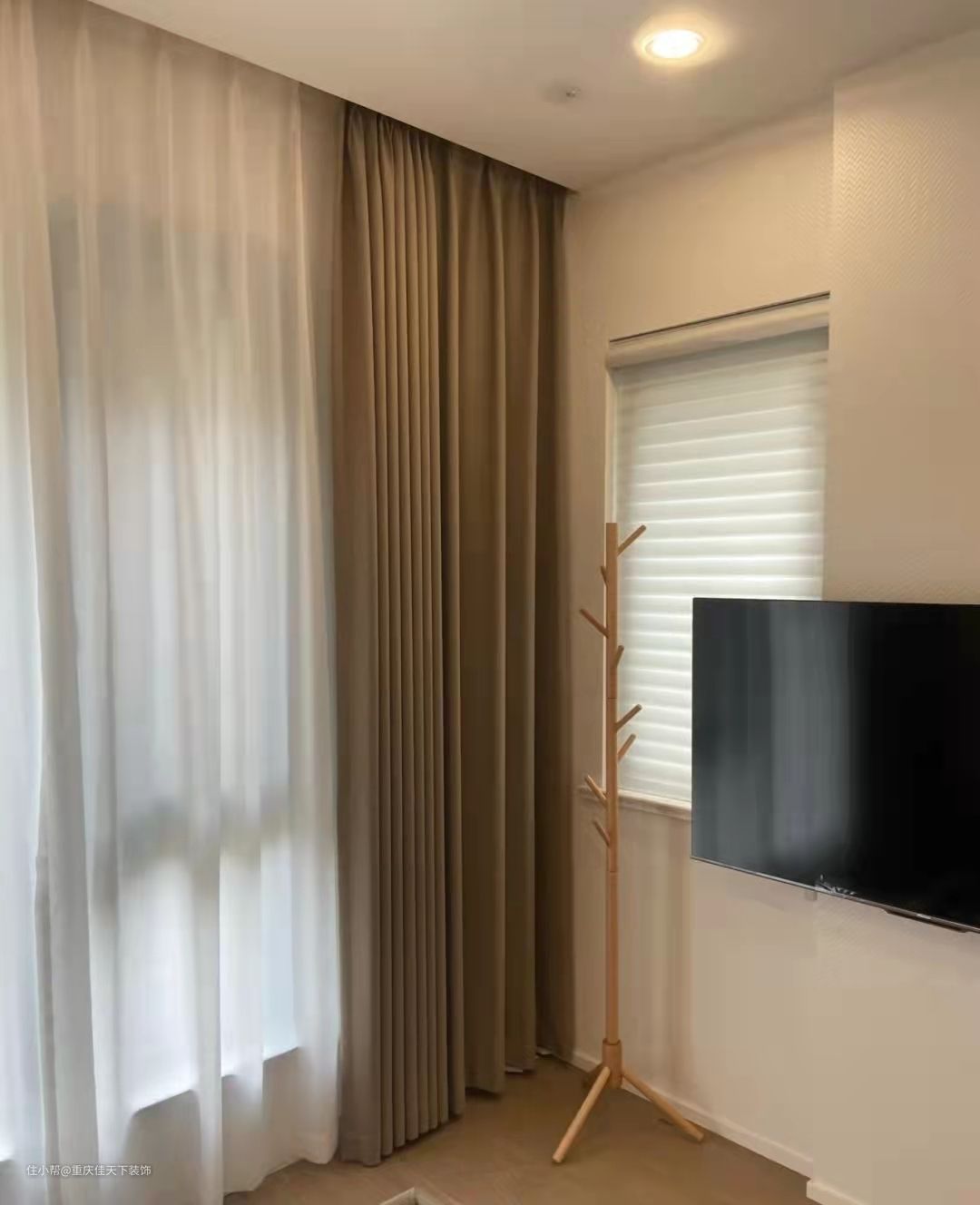 此外,还要注意,窗帘与墙面同色系,但最好不要同色,要有区别,窗帘可以比墙面稍微深一点,打造出层次感,把窗户区域框起来,可以让窗户显大。