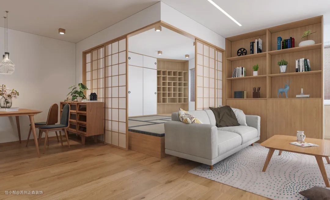 3、多功能的陈设、淡雅的装饰。日式风格装饰主要的装饰品是传统字画、浮世绘、茶具、绿色植物等,有些会直接用和服来点缀室内,色彩清雅质朴,室内氛围纯朴清新。