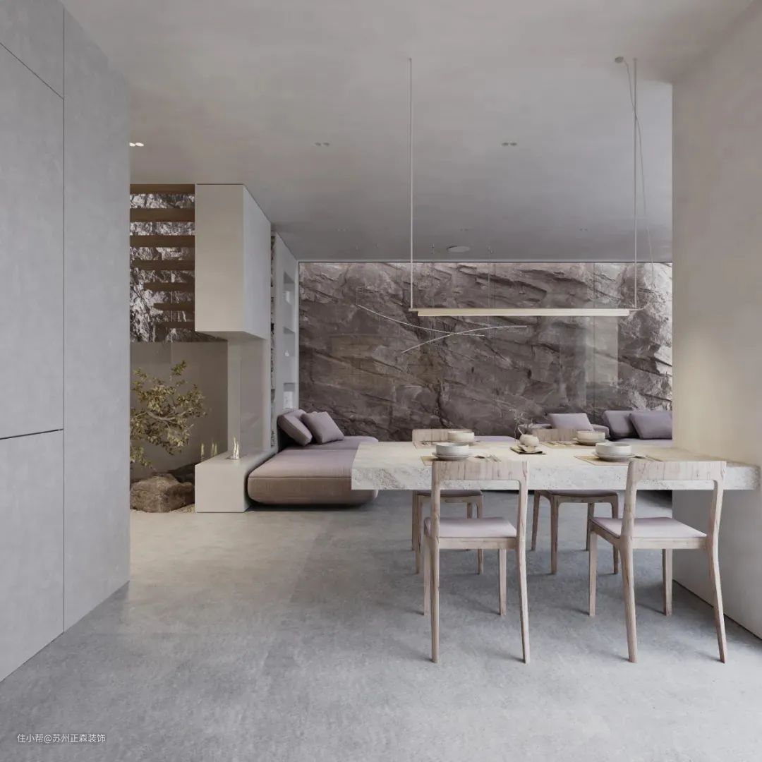 大块石材的运用粗犷、不刻意琢磨的大块石材,像是从大自然中直接搬入室内,试图让室内环境与户外接轨