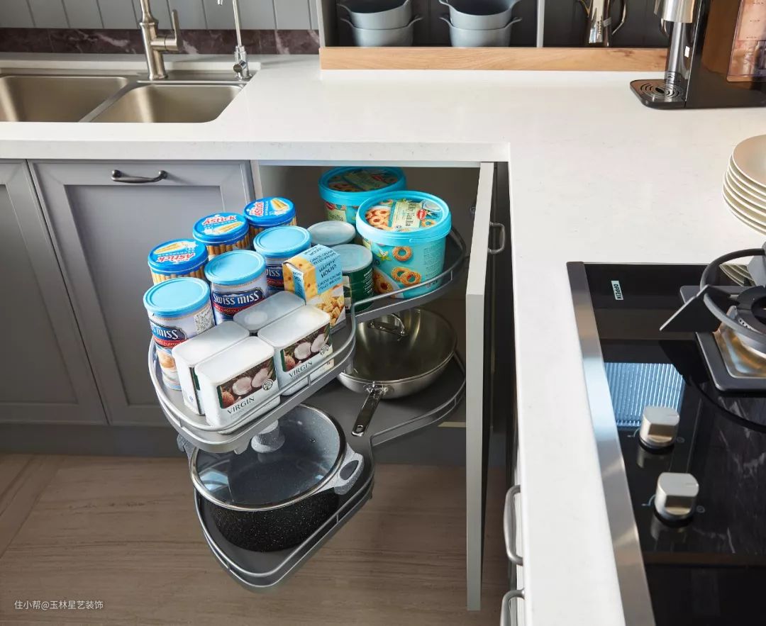 如果家里是L型或者U型橱柜,还可以装一个转角拉篮,把拐角的空间也利用起来。
