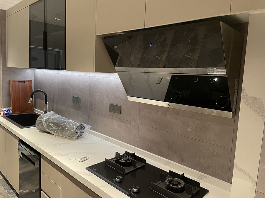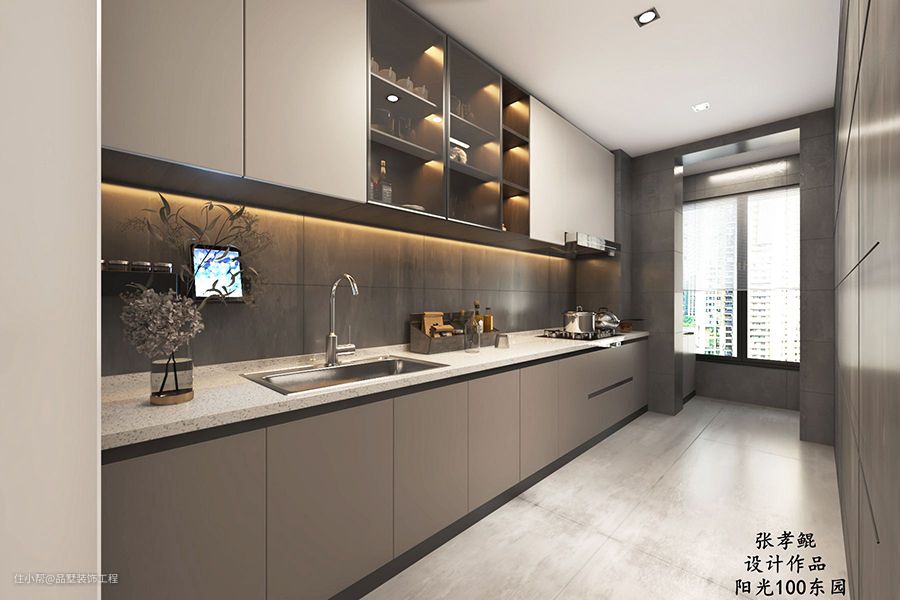 由于小两口在家做饭比较少,一般都是作为西厨使用,所以采用了防水石膏板的设计。吊柜的下方加入了感应式灯带,在晚上端着水果进厨房的时候感应灯直接照亮操作区,并且有效照亮了切水果时操作区产生的影子。