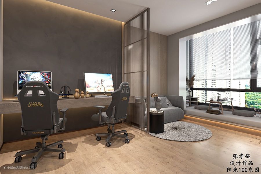 电竞房同时满足了电脑游戏、电视游戏以及喝茶聊天的功能。光源上考虑到了业主在玩任何一种游戏的时候的照明需求,电脑桌上吊顶的背光灯照亮键盘的同时不影响键盘的背光,也不会造成刺眼的光污染。