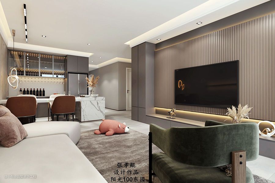客厅采用暗藏式筒灯和轨道灯为照明主光源,线性吊灯为餐厅光源,暗藏式背光灯和灯带作为辅助光源。