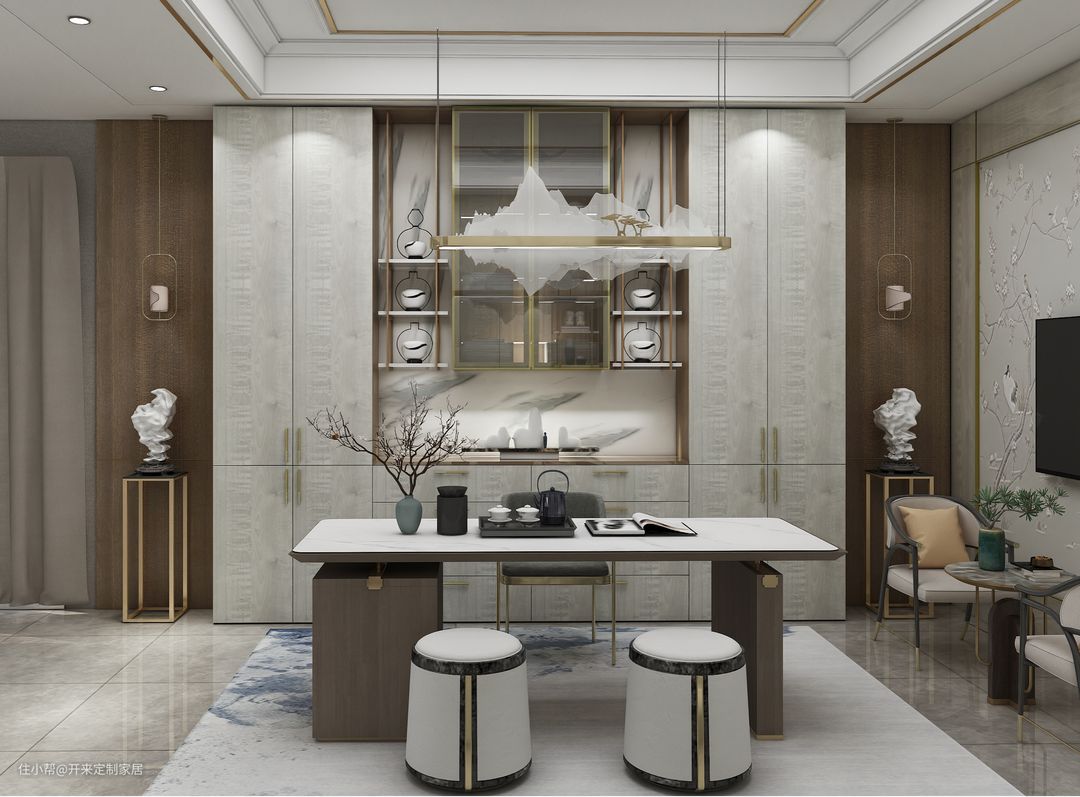 图三是书柜,在金色钢架之间设计金色窄边玻璃门,搭配高光尼斯白门板与云石纹护墙,更突出光滑的质感。