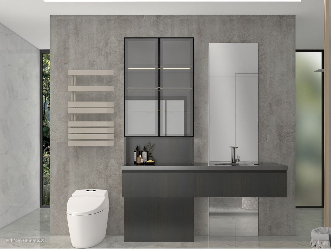图八到图九,厅柜与卫浴柜,玻璃门均有银镜面的质感,与极窄黑色边框搭配,在大地色系的柜体增添一抹独特的亮泽。