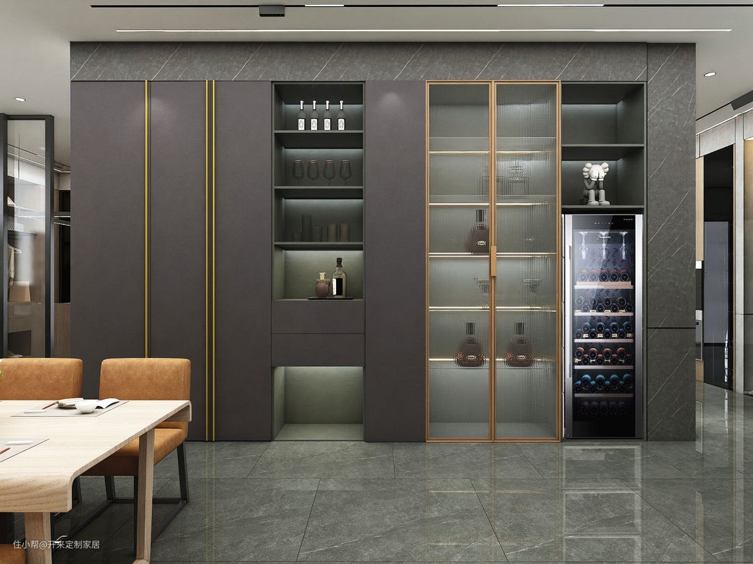图一是餐边柜,在星空灰中,金色窄边长虹玻璃门更加夺人眼球,长虹玻璃的波浪条纹映衬玻璃隔板灯;